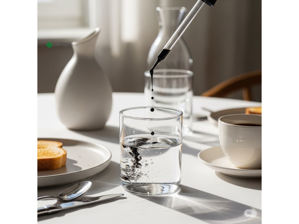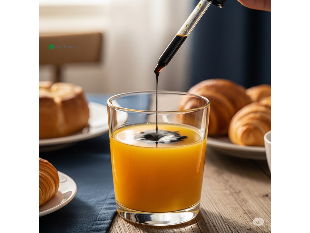 Doporučené dávkování: Pro dospělé stačí rozmíchat 4 až 5 kapek roztoku ve sklenici vody 1 až 2 krát denně. Užívat můžete před, během nebo po jídle.
